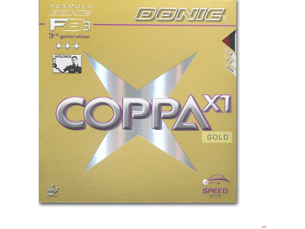 Tento potah Coppa X1 Gold je měkčí variantou potahu Coppa X1 Turbo Platin. Nabízí vyšší letovou křivku a tím pádem menší množství chyb. Vyniká u něj výborná kontrola míčku. Vhodný pro útočné hráče, kteří ve své hře preferují kontrolu a pocit míčku na pálce. Výsledkem výzkumu je nová technologie s názvem FORMULA DONIC třetí generace - FD3. Potahy s touto převratnou technologií jsou vyráběny ve dvou sériích - ACUDA a COPPA X. Acuda S1, Coppa X1 Turbo (Platin) a Coppa X1 Gold patří díky speciální struktuře pórů v houbě k nejrychlejším potahům určených pro vyložené útočníky. Potahy Acuda S2 a S3 stejně jako Coppa X2 (Platin Soft) a X3 (Silver) jsou určené pro technické útočníky a topspináře. Díky měkké houbě jsou velmi příjemné a lehce kontrolovatelné při topspinové hře.